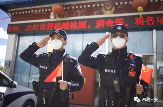 林周县觉德岗路便民警务站干警与国旗合影。通讯员 格桑索朗 摄