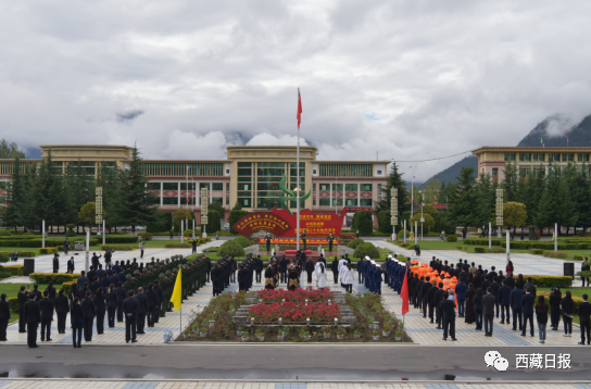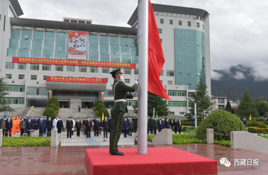 林芝市委、市政府在党政广场举行升旗仪式,庆祝中华人民共和国成立73周年。宋建兴 摄