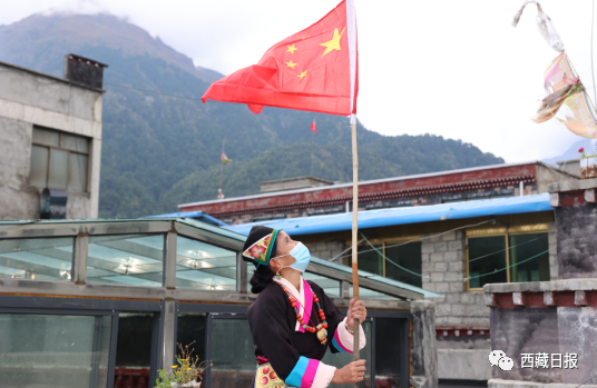 在祖国73年华诞之际,比如县茶曲乡耐秀村多加一家人,在自家屋顶升起鲜红的国旗,祝福祖国繁荣昌盛,国泰民安。白玛顿多 摄