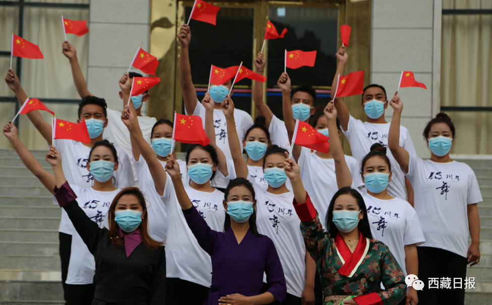 琼结县基层文艺工作者与国旗合影。白玛曲珍 德吉拉珍 摄