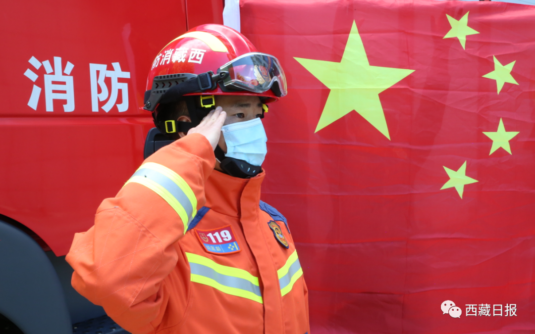琼结县消防救援大队队员与国旗合影。白玛曲珍 德吉拉珍 摄