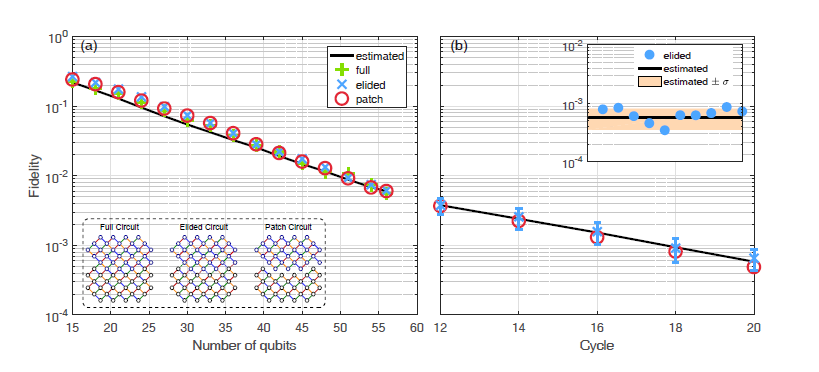 也许有人会有疑问,随机线路问题的最终输出结果是某种模式的概率分布,而我们进行的随机线路采样只是对这一概率分布进行采样,而在“量子优越性”区域,我们又无法通过经典模拟来对量子计算结果进行比较,那么如何来验证量子计算结果的正确性呢?让我们结合上图来回答这个问题。图a展示了对于固定线路层数(10层),将比特数从15逐渐增大至56的随机线路采样的结果;其中包含了两类简化版随机线路(Patch Circuit, Elided Circuit,见图a左下方插图)和一类完整版随机线路(Full circuit)。