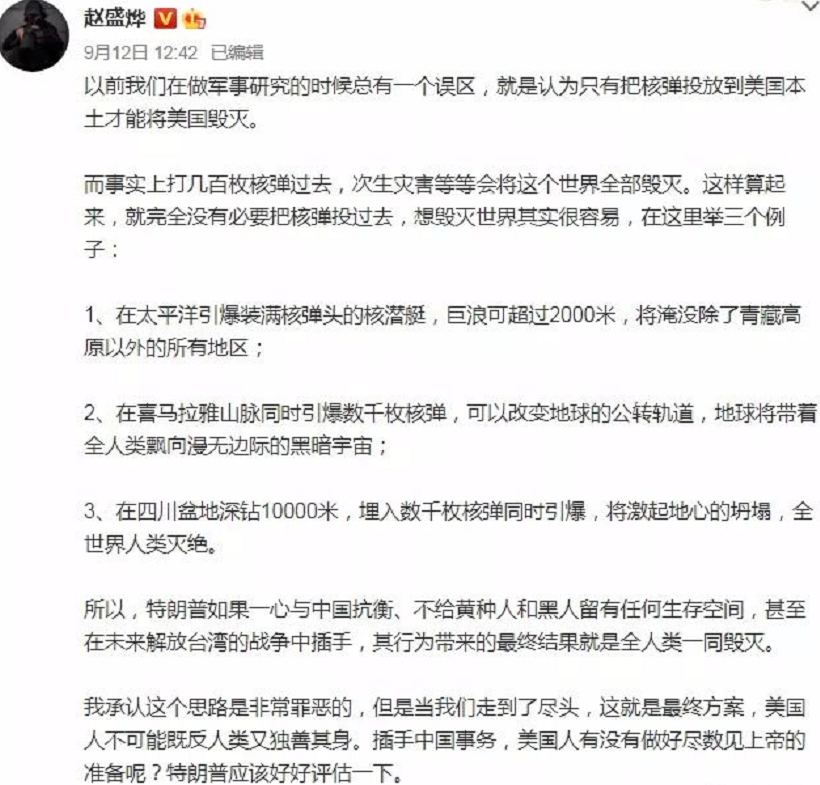 按照这个烂人的观点,14亿中国人,外加数十亿地球人,可以成为特朗普和美国的陪葬工具。