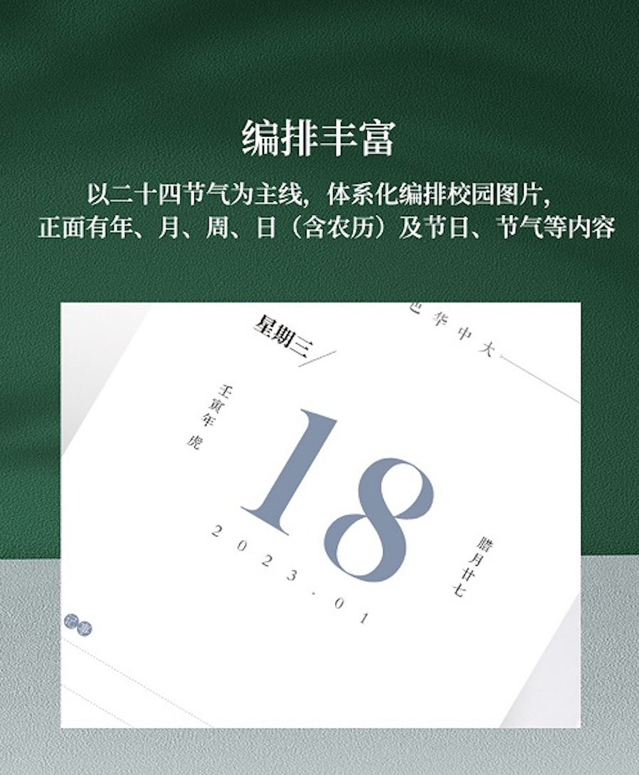 ◆2023年《绿色华中大》日历,以二十四节气为主线,集中展现校园一物一景四时之变,极尽森林大学节气之美。