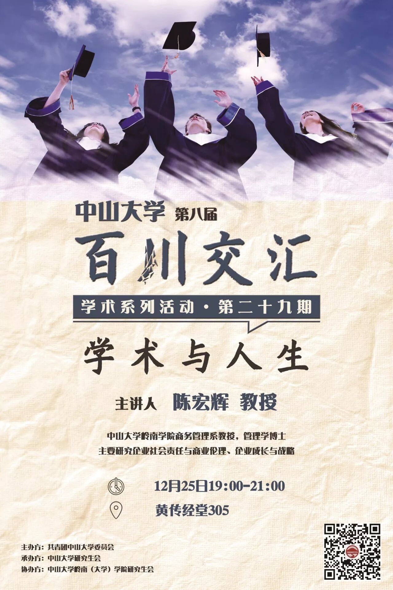 本期百川交汇学术沙龙我们有幸邀请到中山大学岭南(大学)学院陈宏辉教授与同学们分享教授在学术与人生方面的一些想法,希望可以帮助同学们对学术精神和人生方向有更加深刻的认识。