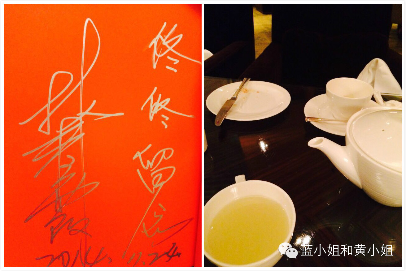 (上图必须嘚瑟!大美人留于黄小姐的亲笔签名,还有,与大美人同桌共进下午茶的美好时光。对啦,你看到的就是大美女用过的茶具杯碟。)
