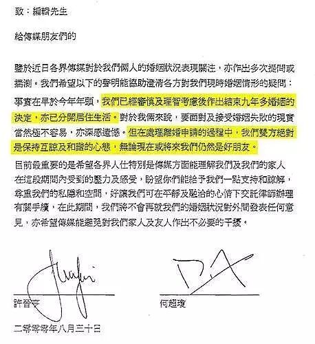 8月30日,何超琼和许晋亨突然发表共同声明,两人正式结束婚姻,目前处于分居状态。