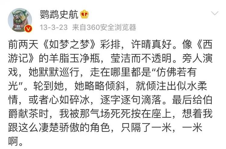 ▲早在2013年就看过许晴演绎《如梦之梦》的史航老师,不吝在微博上表达对许晴演技的赞叹。