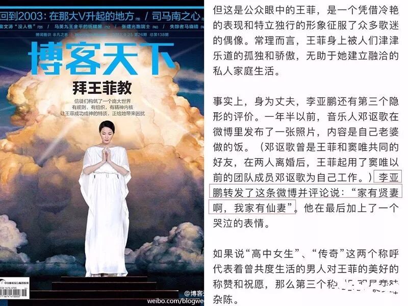 于是,李亚鹏在博客中以“妻”来称呼王菲,那是蕴含着浓浓传统意味的称呼——夫唱妇随、妻贤子孝。