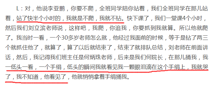 有一次表演课,老师要求所有的学生“解放天性”,爬着从别的同学腿下经过,说白了就是钻裤裆。李亚鹏就无法接受这种行为,憋了半个多小时,憋出了一滴眼泪。