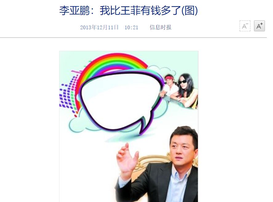 那时的李亚鹏已经与王菲度过了几年的婚姻生活,也一直被冠以“花老婆钱”的名号。虽然李亚鹏不止一次地说过,自己比老婆有钱多了。但是围绕在他身上的焦点,始终绕不过去这个隐晦的话题。