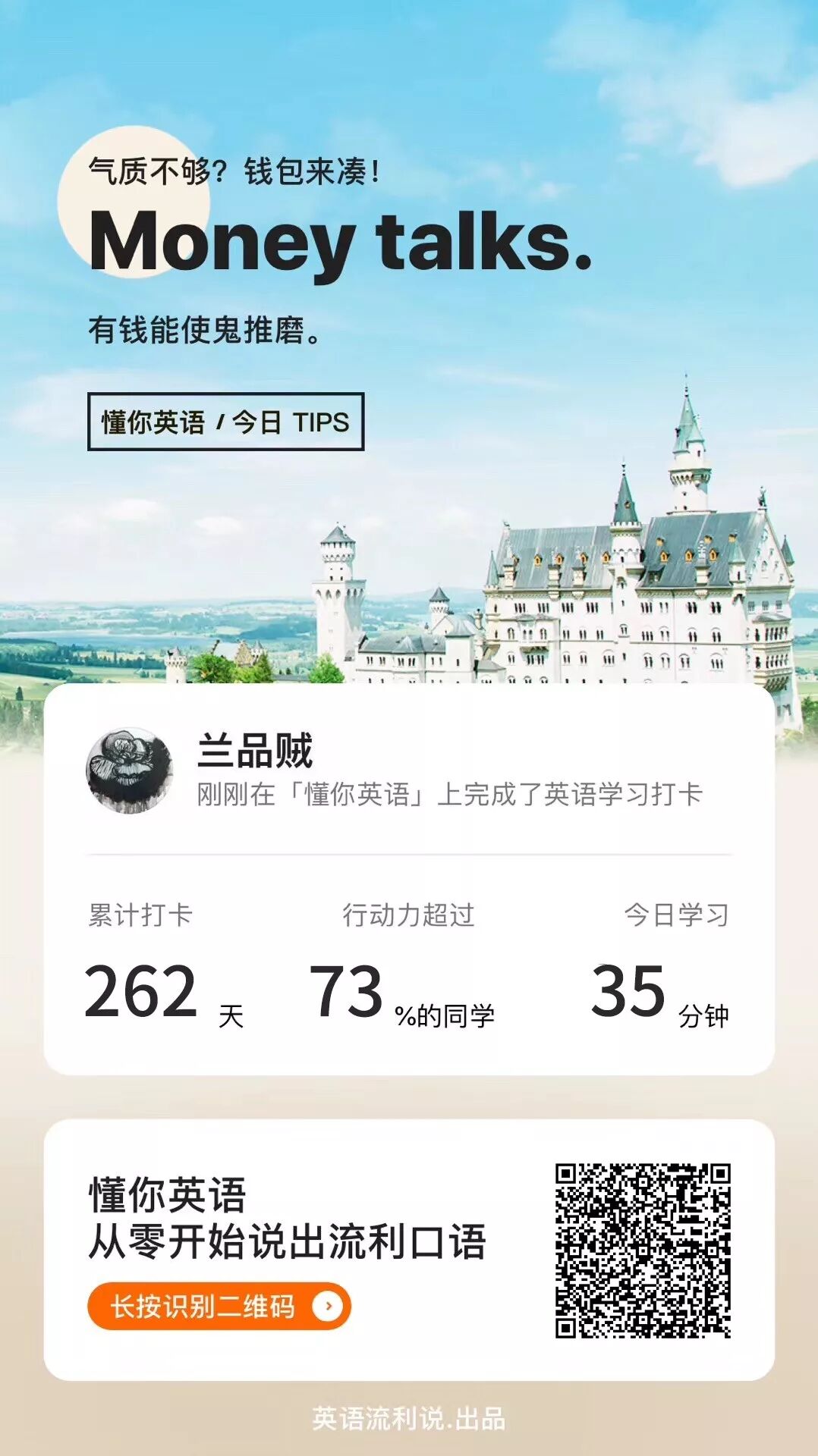 在懂你英语学了小半年,说真的还真有点后悔没有早一点遇到它,它真的像一位非常“懂你”的良师益友,一直在鼓励你,不论你是多么薄弱的基础,只要你想学,想要改变,就还来得及。