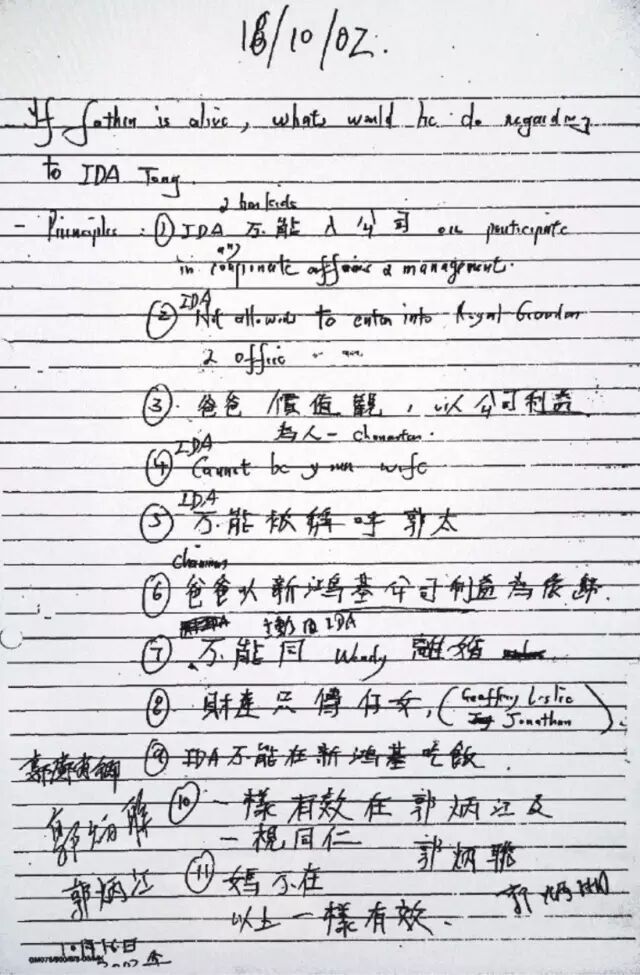 ▲在坊间流传的这张郭老太订下的十一条家规很有意思,头二条即是关于Ida及其子女不能入公司,后面则是更不准她自称郭太,更不准郭大公子因为她与李天颖离婚,最有趣是最后一条,“妈不在,以上一样有效。”
