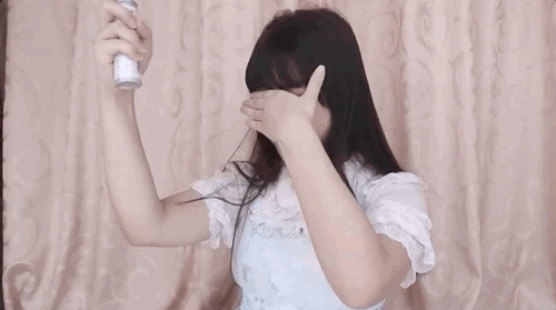 这时候就要像程潇一样用定型喷雾给刘海定型,记住要选喷头温柔细密的,而且不要正对着刘海喷,可以画圈画Z字型之类的,不然一喷会变中分。