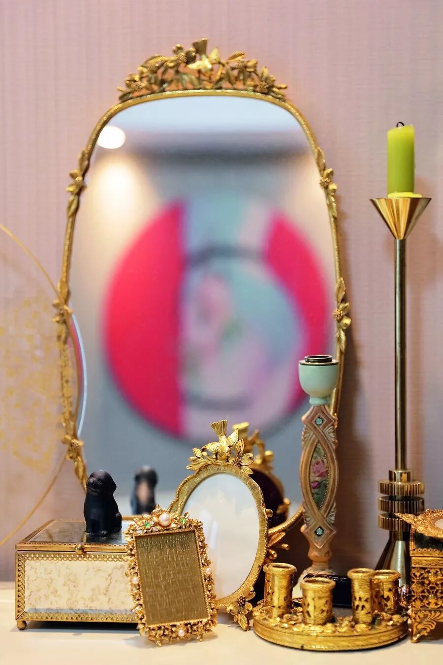 ▲卧室的五斗柜一角,首饰盒是美国买的Vintage(古董),烛台一个是以色列牌子Michal Negrin,另一个是Tom Dixon。镜中倒咉了是黄薇的另一张画,我很喜欢这种闺房感。