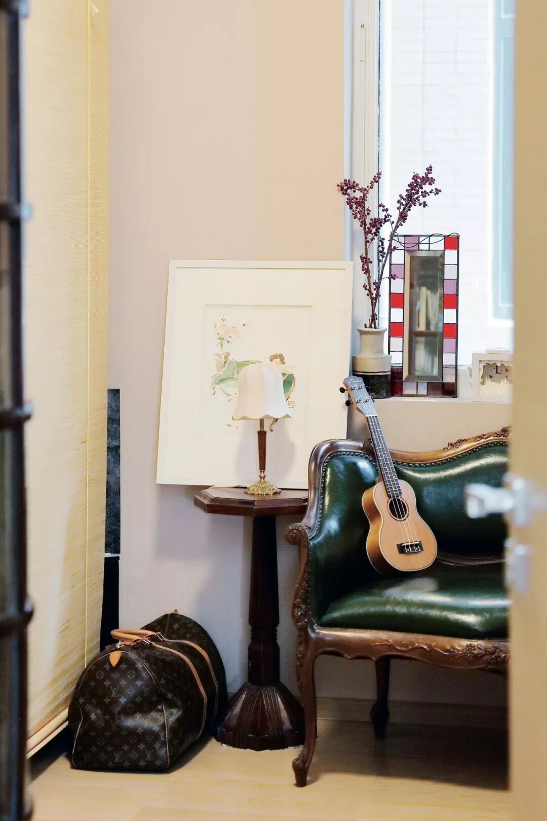 ▲小公寓里的绿沙发是在上海阿王的老家具店淘的。我的好友陆梅给沙发画了一张画,置于边桌。