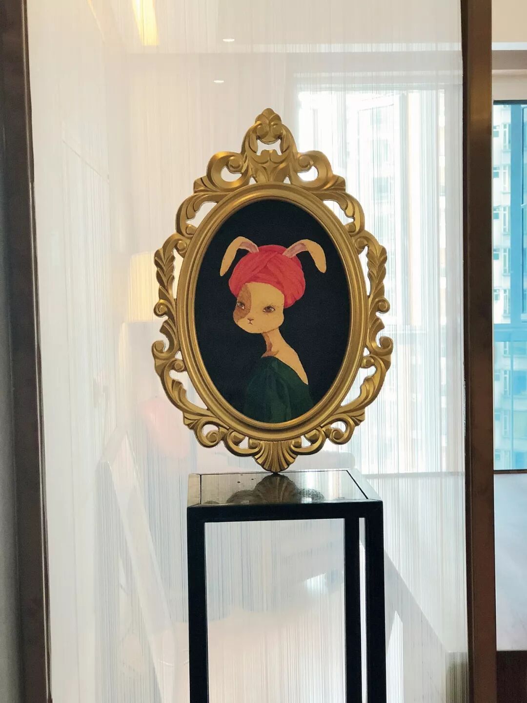 ▲玄关画作背后的夹丝屏风,是在淘宝上订的,加运费1400元,也是全屋唯一永久不能动的东西,画是广州女画家邓瑜的作品。