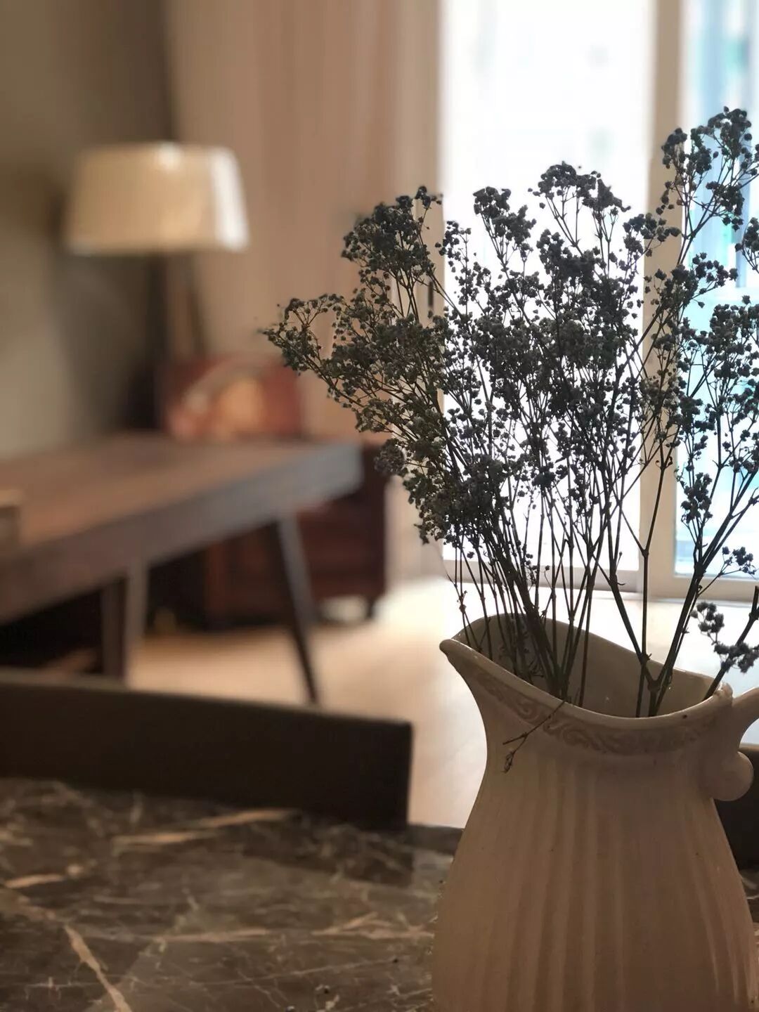 餐厅的桌子也是费老师帮忙挑的,本来我想选白色云石,但被费老师按住,理由是白色桌子太抢眼,会抢掉书桌的中心地位,于是选了灰色,这样不易脏不易旧,清洁也容易。