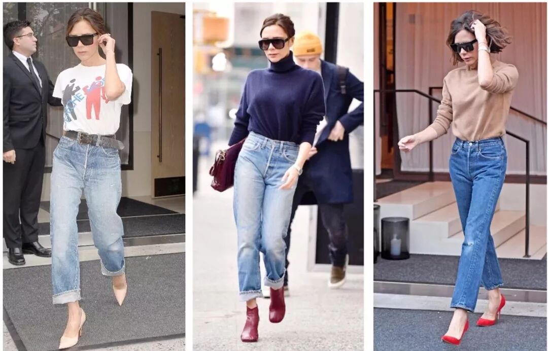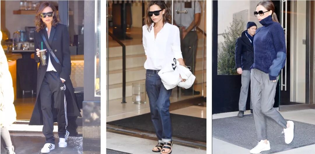 而她衣柜里那些裹身裙高跟鞋铂金包大墨镜,统统变成了阔腿裤,宽松的半裙,舒适的运动装,现在的维多利亚是简约、干练而知性的,我们甚至能看到她穿着最简单的白T恤和牛仔裤,而这种装扮甚至引发了媒体们的惊诧。
