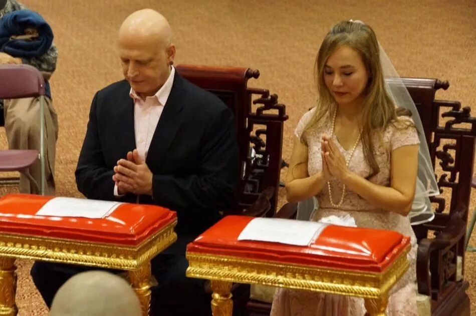 因为是佛教婚礼,两人穿得都很低调,女主角一身粉色裹身蕾丝礼服,腰身还在,长发染成亚麻颜色,头纱也很随性一别,一扎白色鲜花,还是可见正当红那年明媚大美人模样。