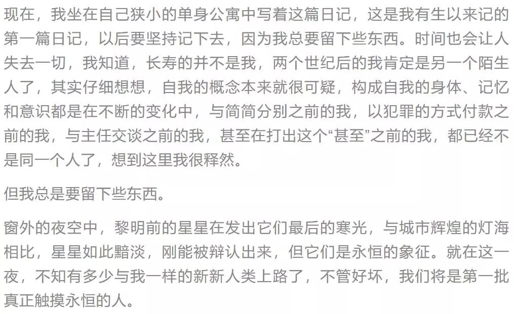 但最让我犹豫的还是简简,这已经是属于理性之外了。在遇到简简之前,我不相信世界上有爱情这回事;在遇到她之后,我不相信世界上除了爱情还有什么,离开她,我活两千年又有什么意思?现在,在人生的天平上,一边是两个半世纪的寿命,另一边是离开简简的痛苦,天平几乎是平的。