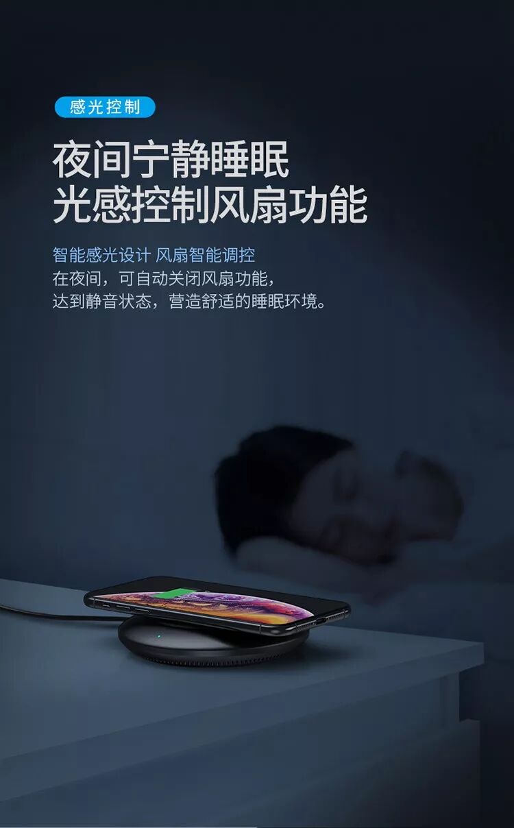 在面板四周的通风孔下面是主动散热系统,风扇会及时带走热量,可以让手机让充电器保持在较低的温度,保证大功率无线充电模式的稳定运行,充电速度更快。与以往带主动散热的无线充电器不同,iWALK这款无线充电器内置的散热风扇可以根据光线亮度不同自行开启或者关闭,即便你在夜晚睡觉时使用它给手机充电,也不用担心会听到风扇工作的声音影响睡眠。
