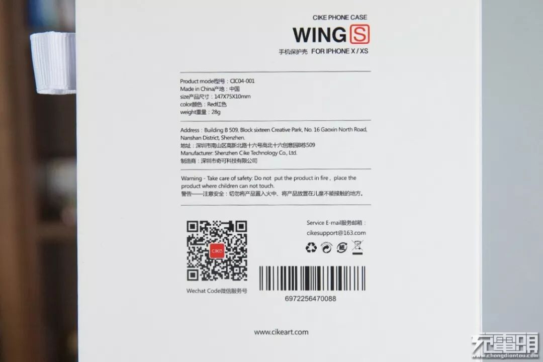 CIKE WINGS 手机壳采用白色硬质抽拉式纸盒包装,盒顶跟抽拉处都有布质挂钩。包装盒中间印有清晰的产品实物图,右上红色”CIKE”LOGO。其中产品与圆LOGO做了激凸加UV工艺,摸上去有凹凸立体感。