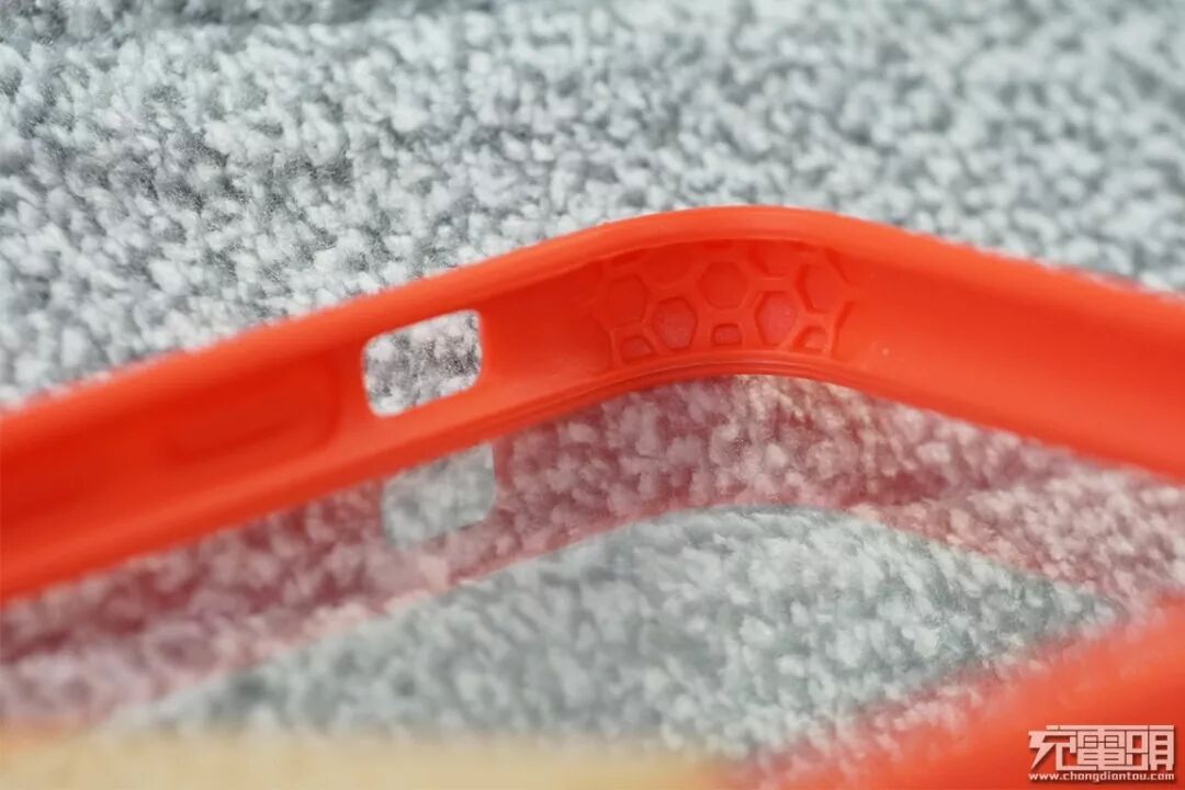 蜂窝缓冲设计特写。CIKE WINGS 手机壳的一大特色就是非牛顿流体材质边框,此外这款手机壳还在四个边角处设置了蜂窝状缓冲设计。这种设计不会增加在手机壳边角处的体积,也不改变外观形状,在四角落地时能缓冲分散应力,减少边角撞坏的风险。