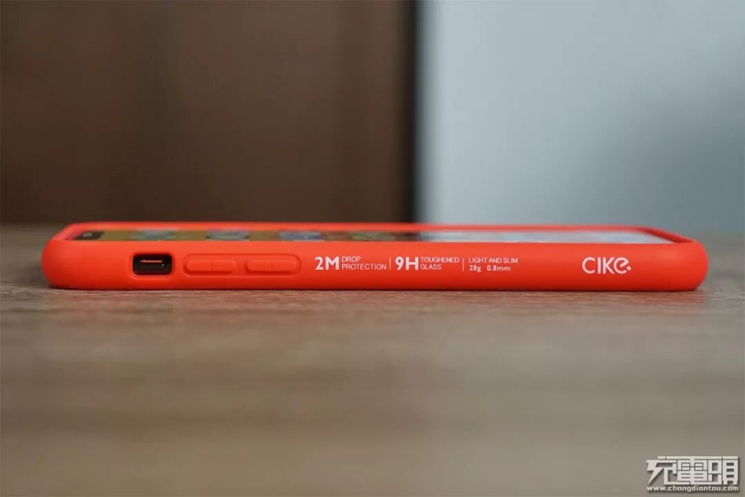 机壳的一侧印制有白色文字。直接把CIKE WINGS手机的特色Solgen:2M跌落、9H玻璃、28克0.8毫米超轻薄打在手机壳上,体现了CIKE对自己产品的自信,也增加了一丝时尚感。音量键区域与电源键设计的方式相同,静音开关则是直接开了孔。