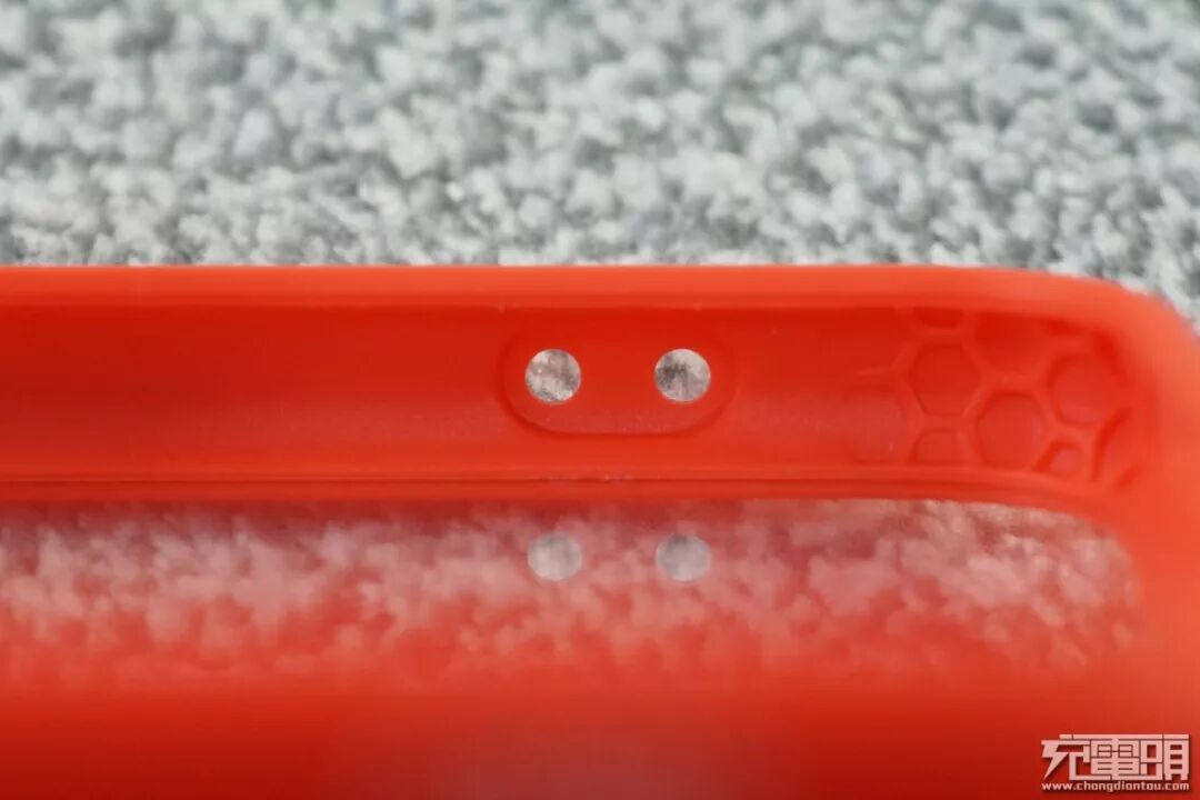 按键内部特写。从手机内侧来看,按键所在区域与手机按键相接触的部位有微微凸起,边缘也做了减小厚度的处理。在降低软胶边框对按键手机的影响下,又保证按键与边框能紧密贴合,减少了按压时的键程。