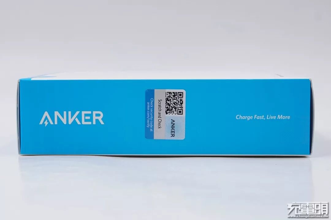 包装侧面有“ANKER”品牌Logo和Charge Fast Live More字样。同时贴有防伪标签,刮开辨别真伪。