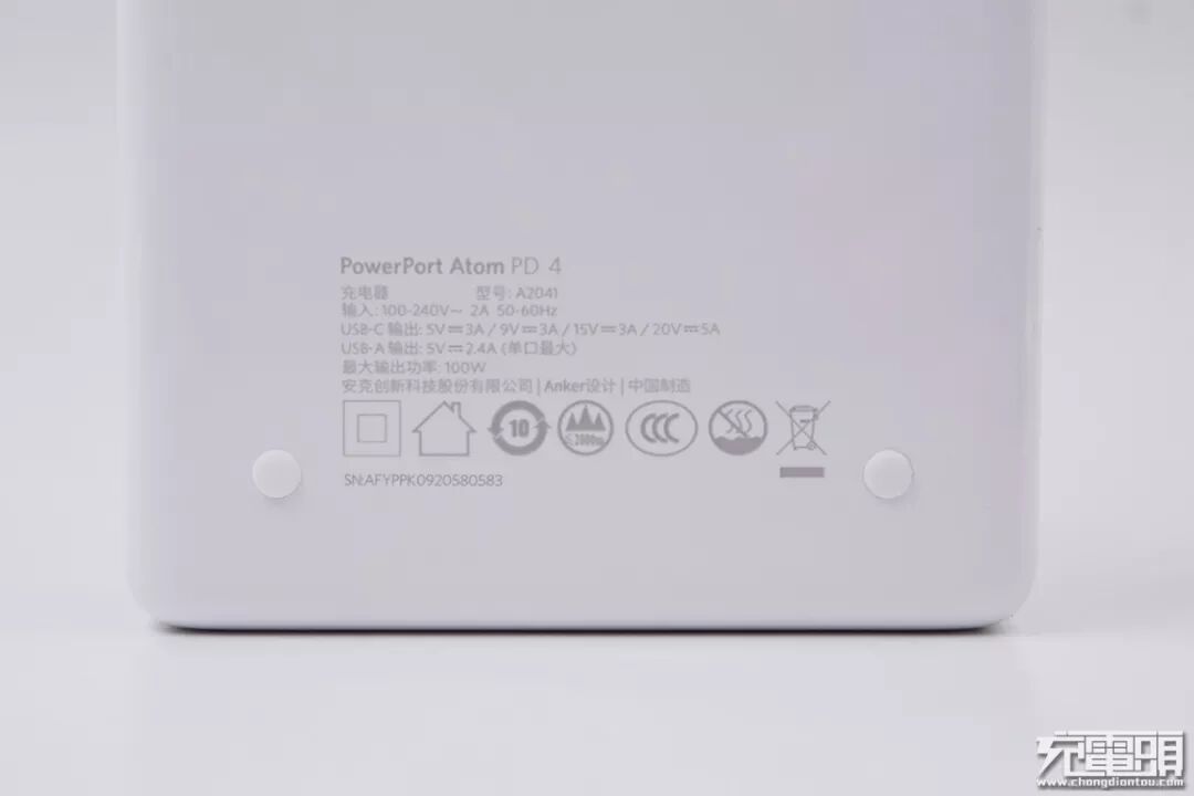Anker PowerPort Atom PD 4 100W充电器的底面四角有硅胶脚垫,放置在玻璃一类较光滑的桌面也比较稳定,同时不易刮花底面板。