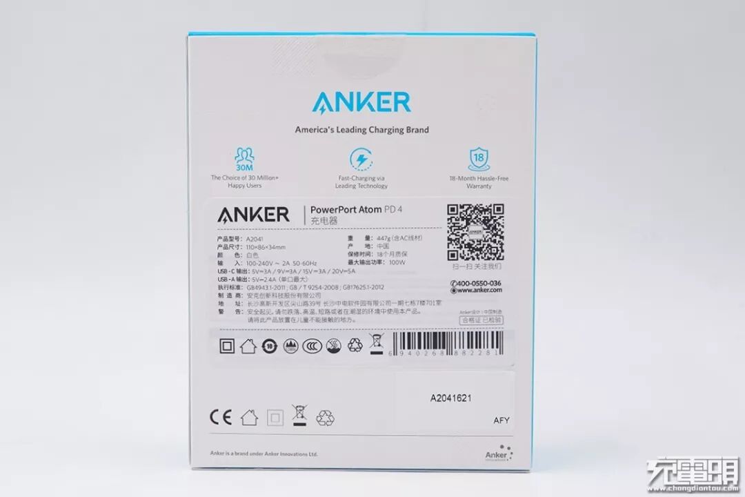 Anker PowerPort Atom PD 4 100W充电器包装与安克最近推出的一系列产品外包装完全一致,仅有大小不同。包装纸盒白蓝基色,正面左上角“ANKER”品牌Logo、右下角小闪电标志、同样印制Charge Fast Live More的品牌标语,辨识度极高。
