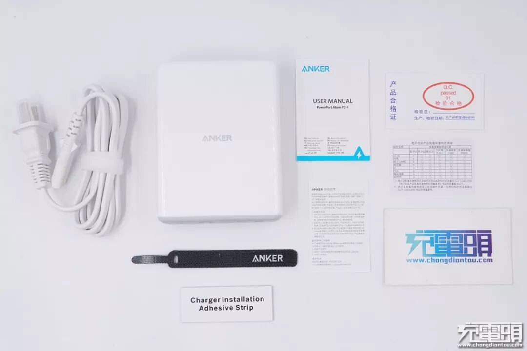 包装内共包含:Anker PowerPort Atom PD 4 100W充电器本体、8字AC电源线、魔术贴扎线带、泡棉胶、说明书、保修卡、合格证、电子产品有害物质清单。
