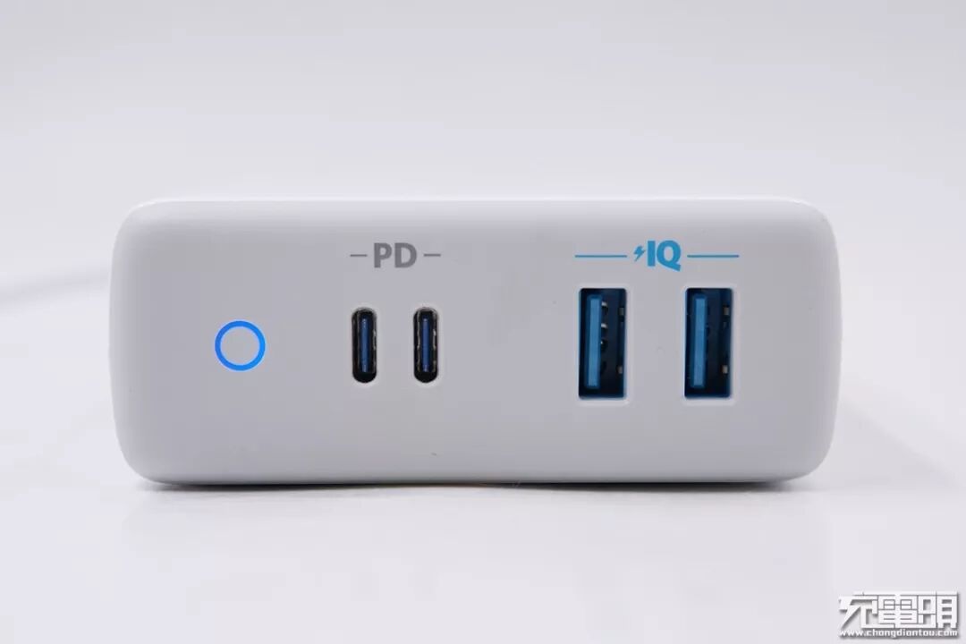 Anker PowerPort Atom PD 4 100W充电器采用阻燃塑料材质、主体部分为白色,表面钢琴烤漆工艺,触感细腻温和。