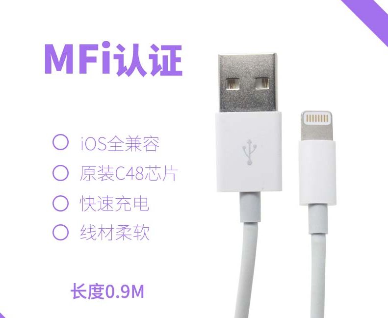 本线材使用TPE材质,C48端子头,MFI认证线,整线类似苹果原装风格,线材超柔软,较细线径不足3mm,支持过2.4A电流和12W功率(苹果A口最大12W),此线为全新货,原箱散装。