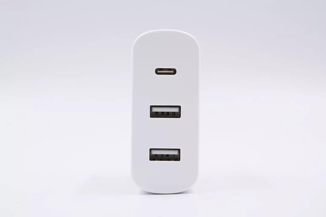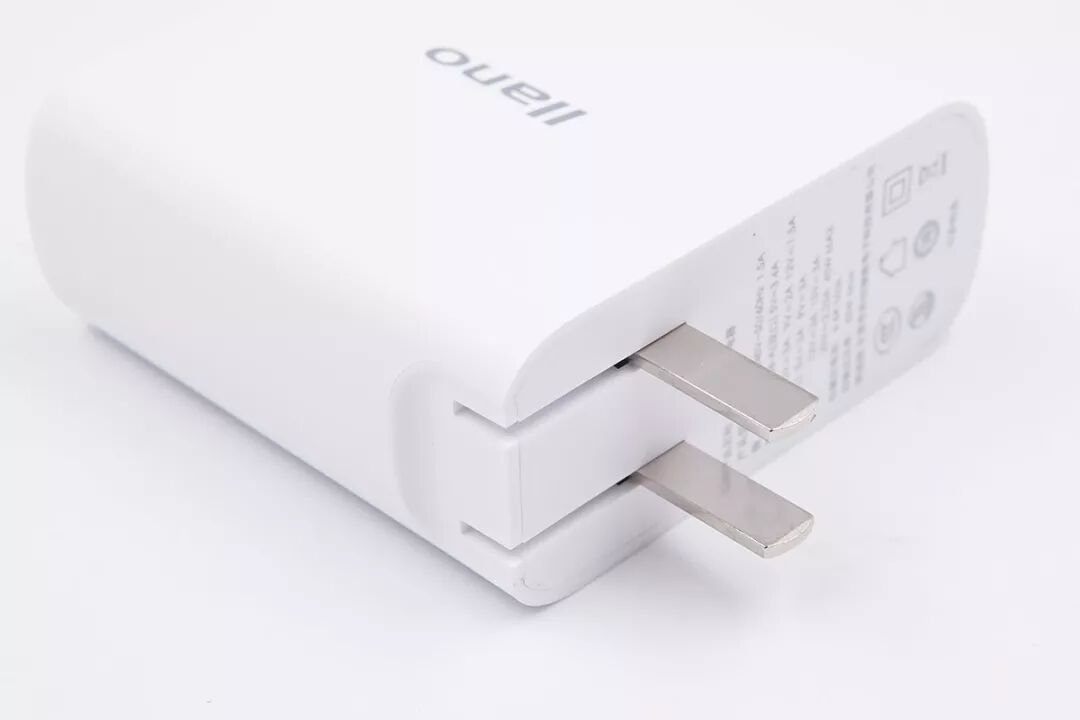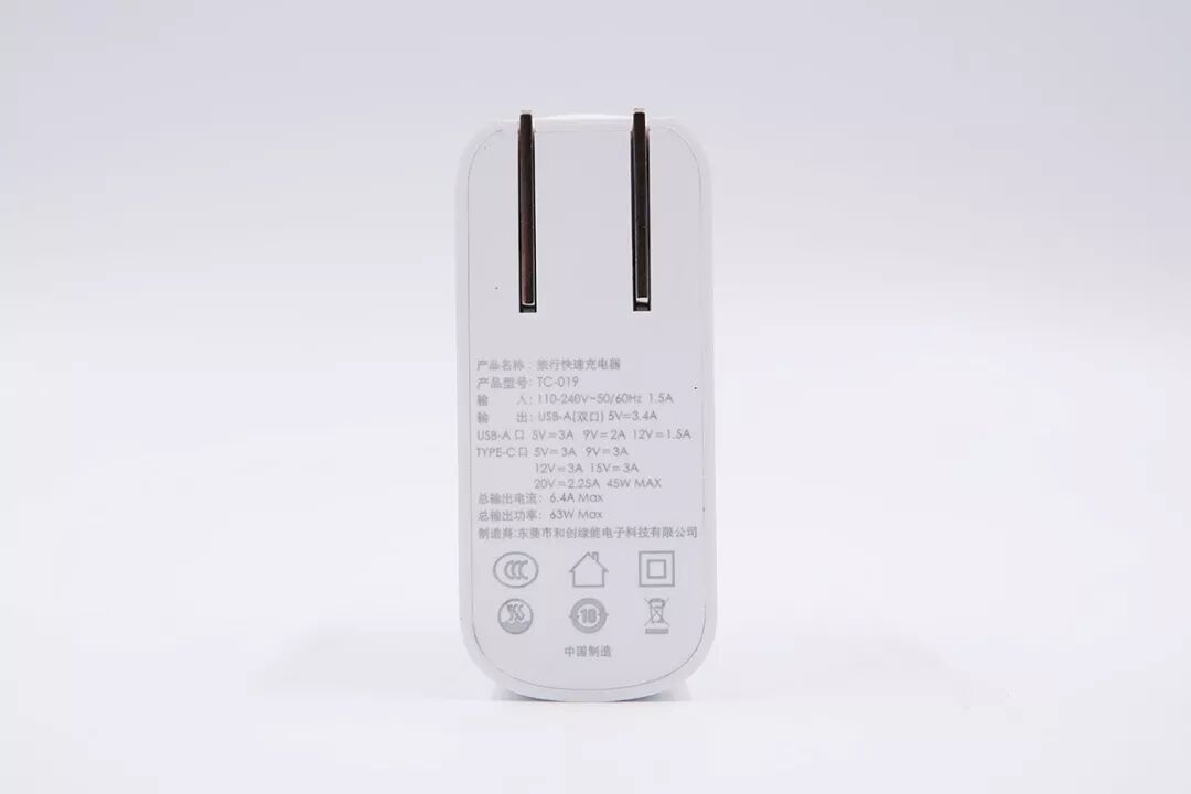 本次团购的绿巨能充电器有着2个USB-A、1个USB-C的接口配置,USB-C口支持Apple2.4A、QC2.0、QC3.0、AFC、FCP、SCP、PD多种协议,拥有5V/3A、9V/3A、12V/3A、15V/3A、20V/2.25A五个固定电压档位,以及3.3V-16V/3A一个PPS电压档位,最大45W功率输出;USB-A口支持Apple2.4A、QC2.0、QC3.0,单口18W功率输出,多口总输出最大支持63W。充电器采用可折叠插脚,比苹果61W单口充电器稍小,重量为163.4g。