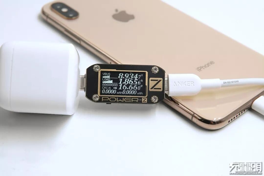 使用ANKER PowerPort Atom PD 1 GaN充电器 + ANKER Powerline II C to Lightning 数据线对iPhone XS Max进行充电测试,当前电压为8.93V,电流为1.86A,功率为16.66W,开启PD快充。