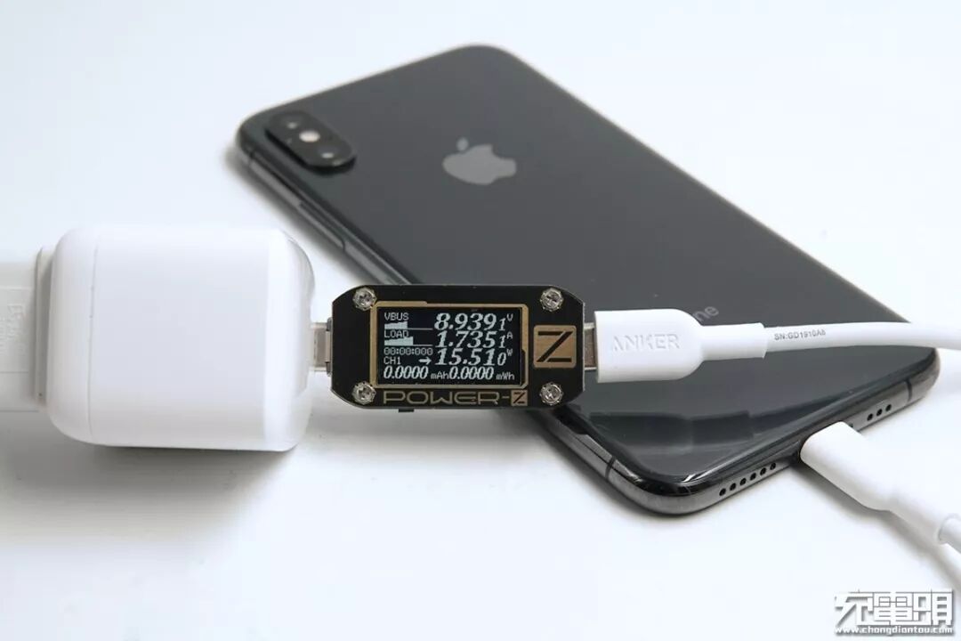 充iPhone XS,电压8.93V,电流1.73A,功率15.51W,开启PD快充。