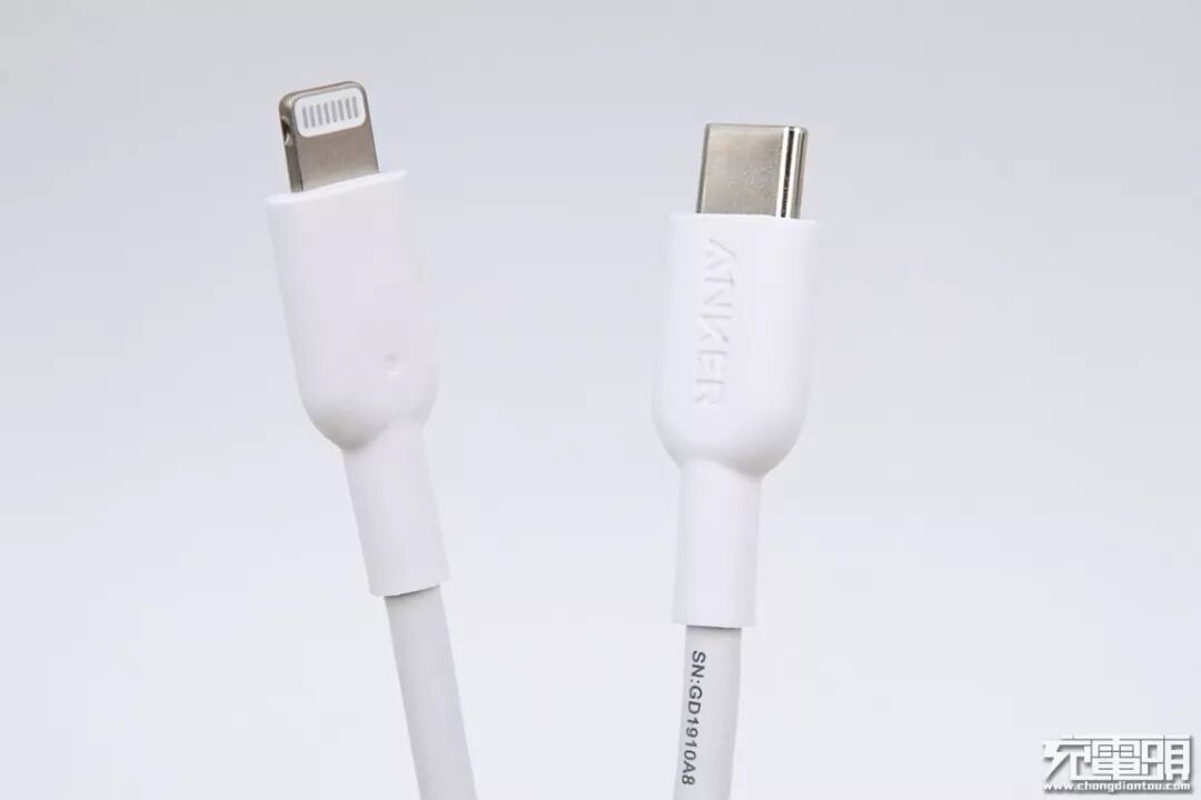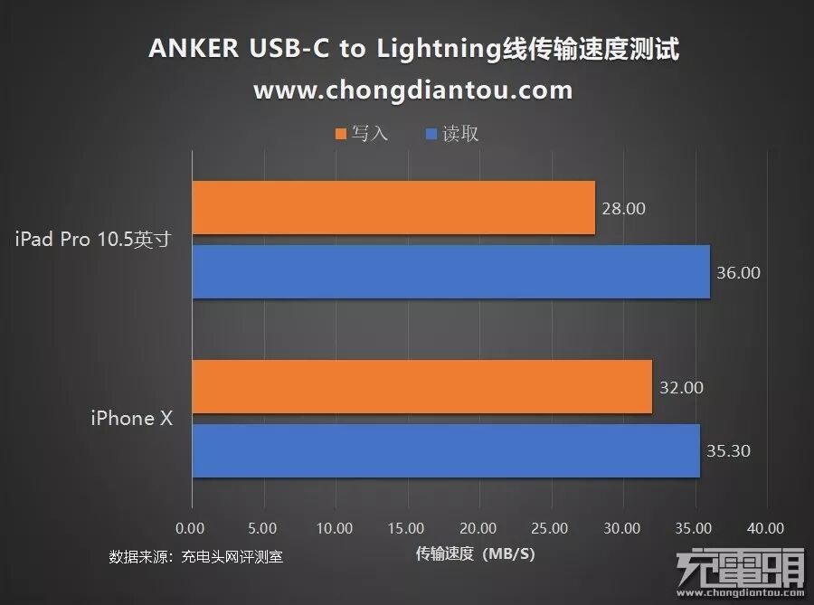 从图表中可以看出,无论是读取还是写入,速度均在30MB/s左右,ANKER Powerline II C to Lightning 数据线与我们之前测试过的苹果原装USB-C to Lightning线传输速度差不多,均为USB2.0标准。 三、充电头网总结 ANKER作为国内首家正式开售USB-C to Lightning数据线的品牌,无论是自身的品牌力还是产品的质量都得到了苹果的认可。ANKER Powerline II C to Lightning 数据线采用了TPE线身材质,表面光滑无明显毛刺,做工优秀。线身与线头连接处进行了加固处理、内置防弹纤维,线材通过了12000次弯折测试,强悍耐用。经过ChargerLAB Power-Z MFi测试仪进行检测后,确认ANKER Powerline II C to Lightning 数据线采用的是原装端子头,测试评分为100分。实际充电测试中,ANKER USB-C to Lightning表现的十分不错,皆可以给测试的数码产品充电并且开启PD快充。ANKER Powerline II C to Lightning 数据线拥有更粗的线径、更长的网尾、更厚的包裹外皮,如果你需要一根可以让苹果快充的USB-C to Lightning线,而且对品质与耐用度有一定要求,ANKER Powerline II C to Lightning 数据线是个不错的选择。