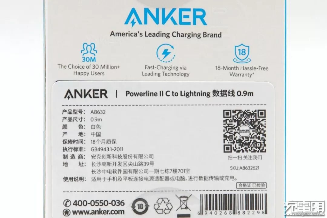 iPhone手机需要获得快速充电功能,除了需要iPhone自身支持USB PD快充之外,还需要一个PD充电器加一根USB-C to Lightning数据线。PD充电器的话市面上选择已经十分丰富,而USB-C Lightning线材虽然苹果开放了第三方USB-C to Lightning MFI授权,但目前(2019年3月)市面上能买到的第三方线材只有一个品牌:ANKER。 ANKER作为海内外知名数码配件品牌,凭借着产品质量与品牌力获得了苹果认可,是首批取得USB-C to Lightning MFI认证的品牌。而且ANKER也是国内第一个现货开售MFi USB-C to Lightning数据线的品牌,这款产品名字叫“ANKER Powerline II C to Lightning 数据线”今天小编为大家带来便是这款数据线的评测,为你做一个选购参考。 一、ANKER Powerline II C to Lightning开箱