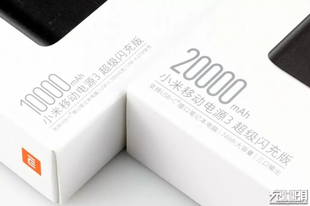 左下角标明的信息可以看出两个产品的区别,首先是容量方面,分别是10000mAh电池容量和20000mAh电池容量,其次20000mAh版本还支持三口输出。两个产品的名称相同,都叫小米移动电源3超级闪充版。下面的小子有一点区别,10000mAh的款式上写着支持USB-C接口笔记本电脑、USB-C 50W闪充、USB-A 27W快充;而20000mAh的款式上写着支持USB-C接口笔记本电脑、74Wh大容量、三口输出。