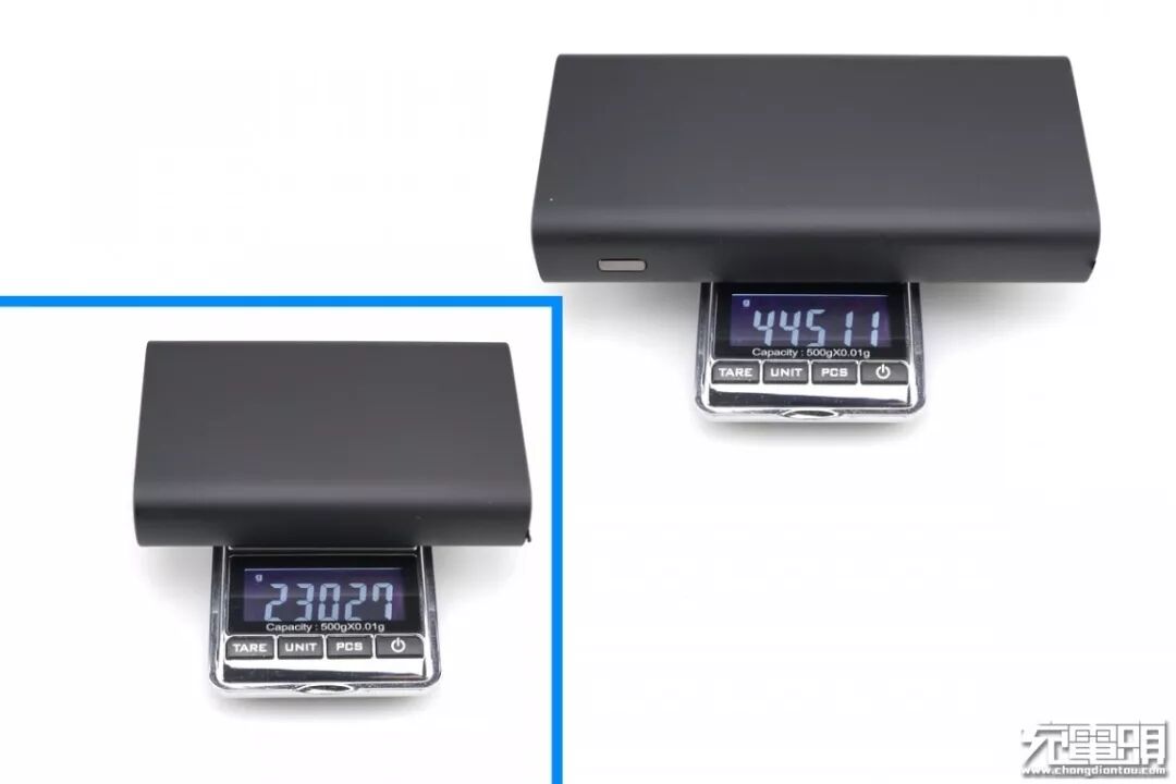 将两个移动电源分别称量一下重量,10000mAh重230g,20000mAh重445g,可以看出20000mAh要比10000mAh重量上要多出215g。