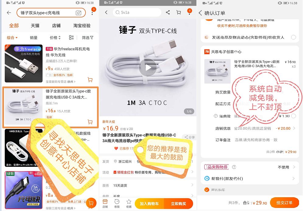 购买方式:淘宝搜索“锤子双头Type-c充电线”,寻找“天思电子创意中心”店铺,直接拍下,系统自动减免,掌柜不太喜欢限购,先到先得,需要多少个拍多少个。