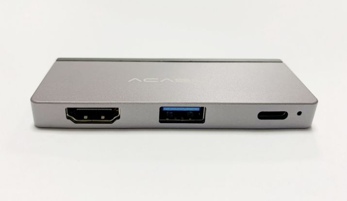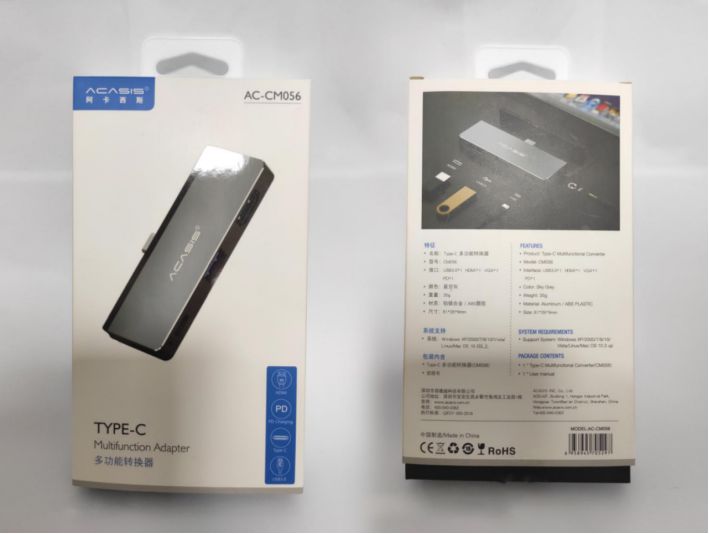 这款产品的礼盒外包装极其高大上,采用了阿卡西斯一贯的抽拉式蓝白硬纸盒+EVA内托礼盒包装,正面是扩展坞特写,背面是参数和特性介绍。从包装可以看出,这款拓展坞支持手机、平板电脑拓展,而且支持高清视频传输,对于大片爱好者而言,可真是福音。