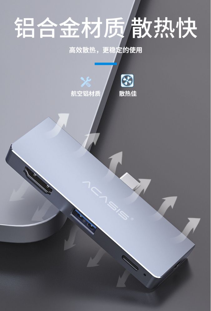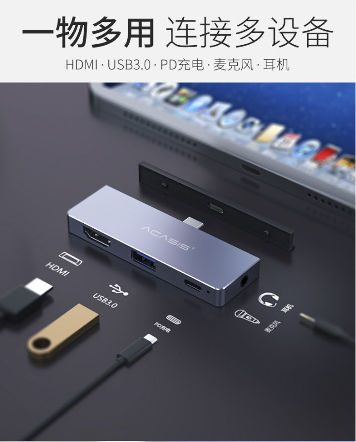 阿卡西斯四合一扩展坞特别适用于专业人员,如需要更多的接口设备。在公司、家庭或商业演示时使用手机或平板电脑扩展坞,就可以增加手机、平板电脑的易用性和优量的扩展性,阿卡西斯四合一扩展坞可获得HDMI高清接口、USB3.0、PD充电、麦克风或耳机等的扩展功能。这五大功能正正是我们日常生活跟办公最需要的功能。