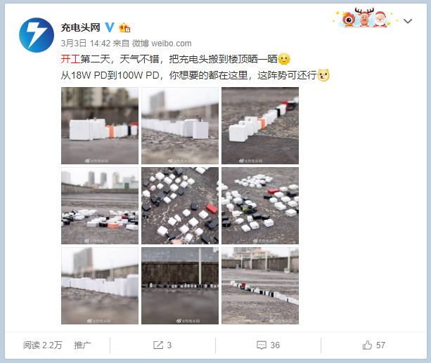 这周充电头网编辑部小伙伴们已经陆续回到深圳办公室,近期深圳天气不错,开工第二天,我们把充电器都拿出来在天楼晒一晒,从18W PD到100W PD,你想要的都在这里,这阵势可还行?晒完后,这些充电器也要正式开工了。