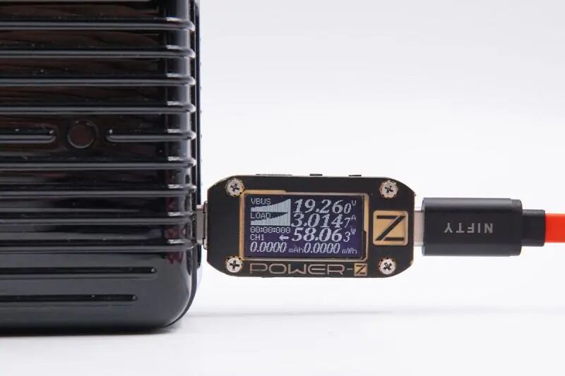 线阻阻值大概0.118左右,通过POWER-Z测试测试充电功率,可以看出,电压19.26V,电流3.014A,功率58.06W,达到了PD 60W水平。