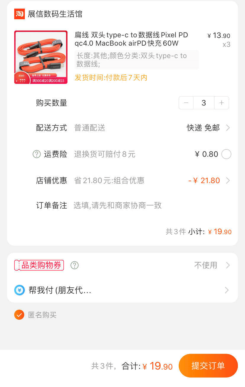 领券后直接拍下,购买数量改为3条,系统会自动减价到19.9~