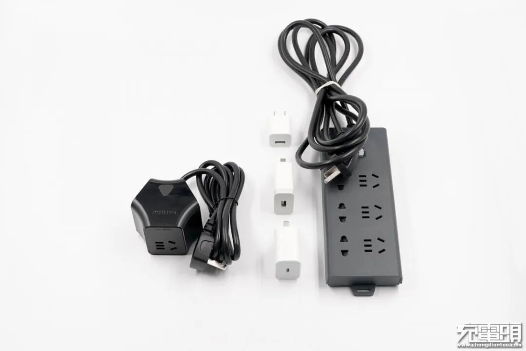 PHILIPS飞利浦摩天轮PD快充插座带有三个USB输出口三个AC交流插孔,可以满足大部分用户出门需求,右边是普通插线板加三个充电器,对比之下可以看到差旅用户带上飞利浦延长线插座节省出更多行李空间,做到方便出门不累赘。